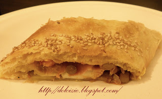 2- Chiudete la sfoglia come se fosse uno strudel, spennellatelo con l’uovo sbattuto e cospargete con semi di sesamo.