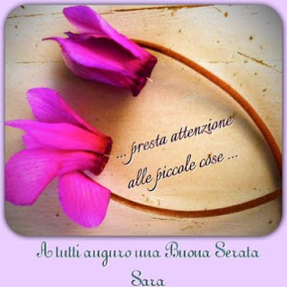 HomepagePost vari Sara Fumagalli 14 anni ago Categories: Post vari Pensierino … UN PICCOLO PENSIERINO PER AUGURARVI UNA BUONA SERATA A DOMANI SARA P.s. ciclamini di montagna… profumatissimi !!!! More from my sitePolpette di pesce e cous cousTorta variegata al cacaoCaramelle mou al burro salato *Cestino Re-Cake 2.0Un pensiero per tutti gli amici di Dolcizie …SBRICIOLATA RICOTTA E CIOCCOLATOPane dolce di cioccolato e cannella Schiacciata all'uva » « Torta soffice al limone Sara Fumagalli: