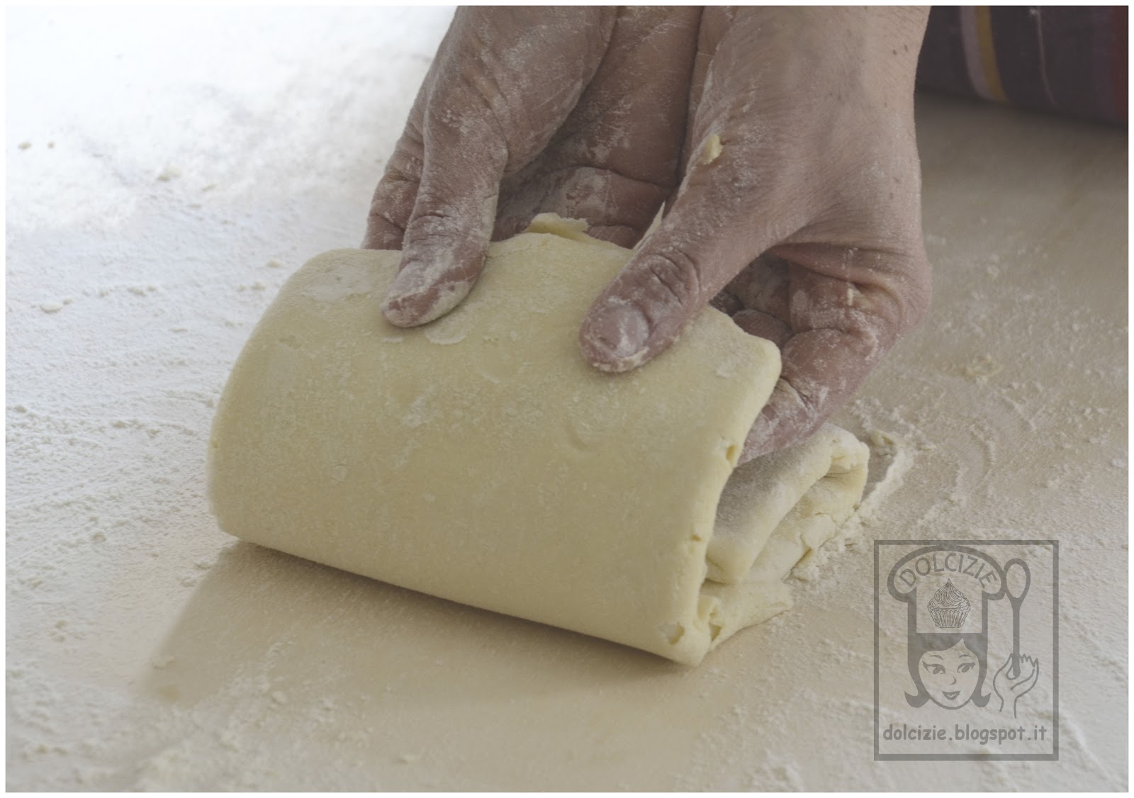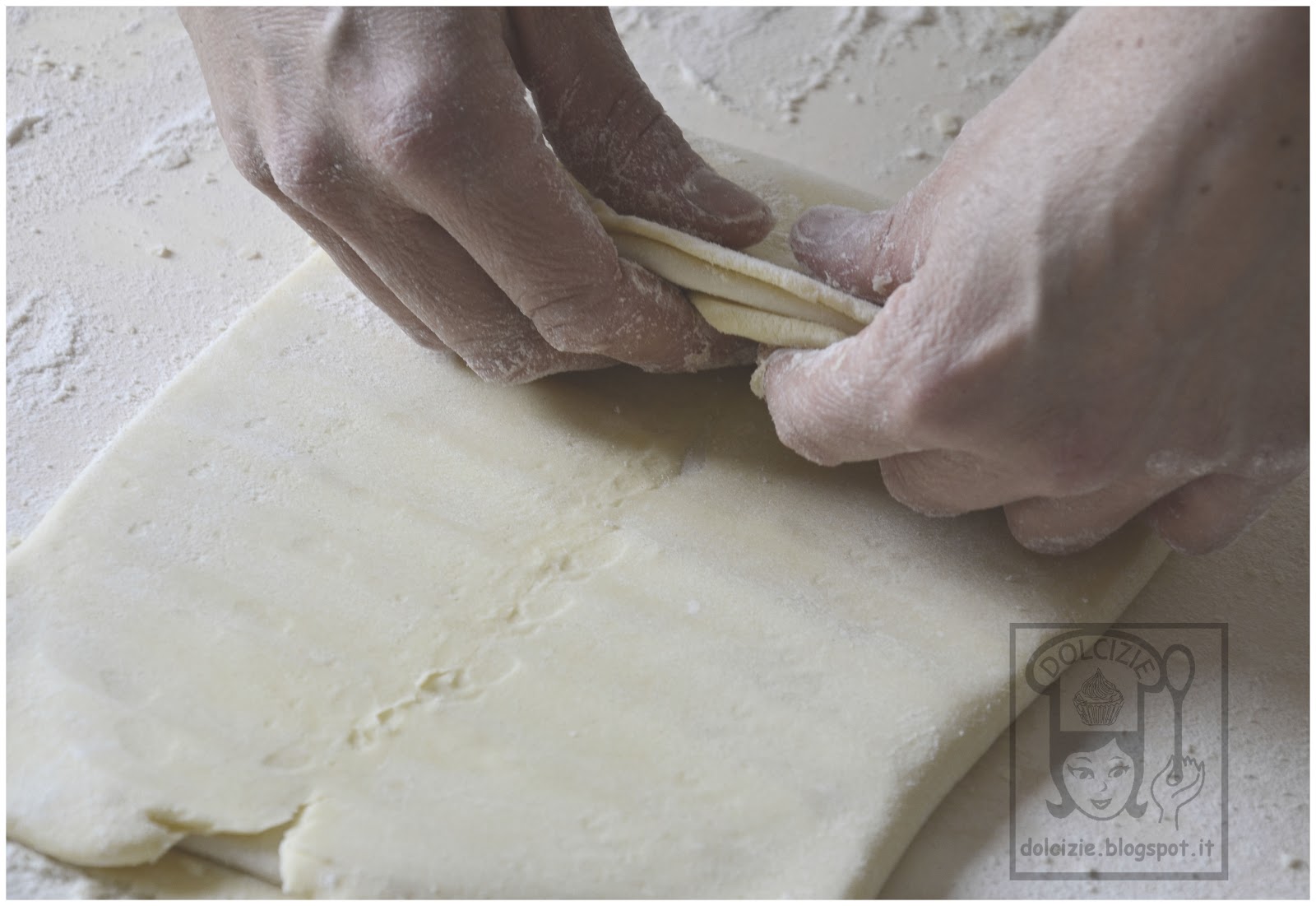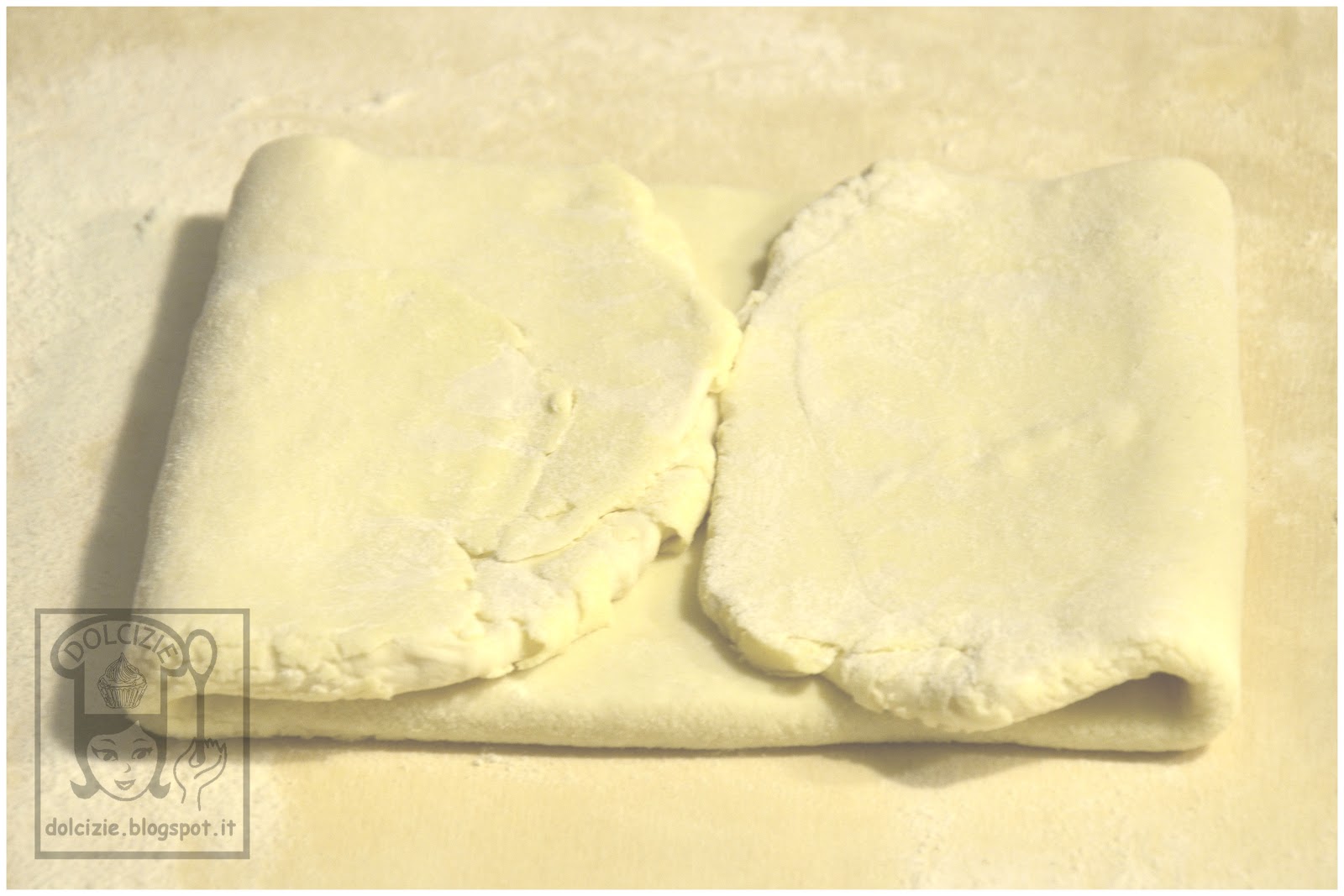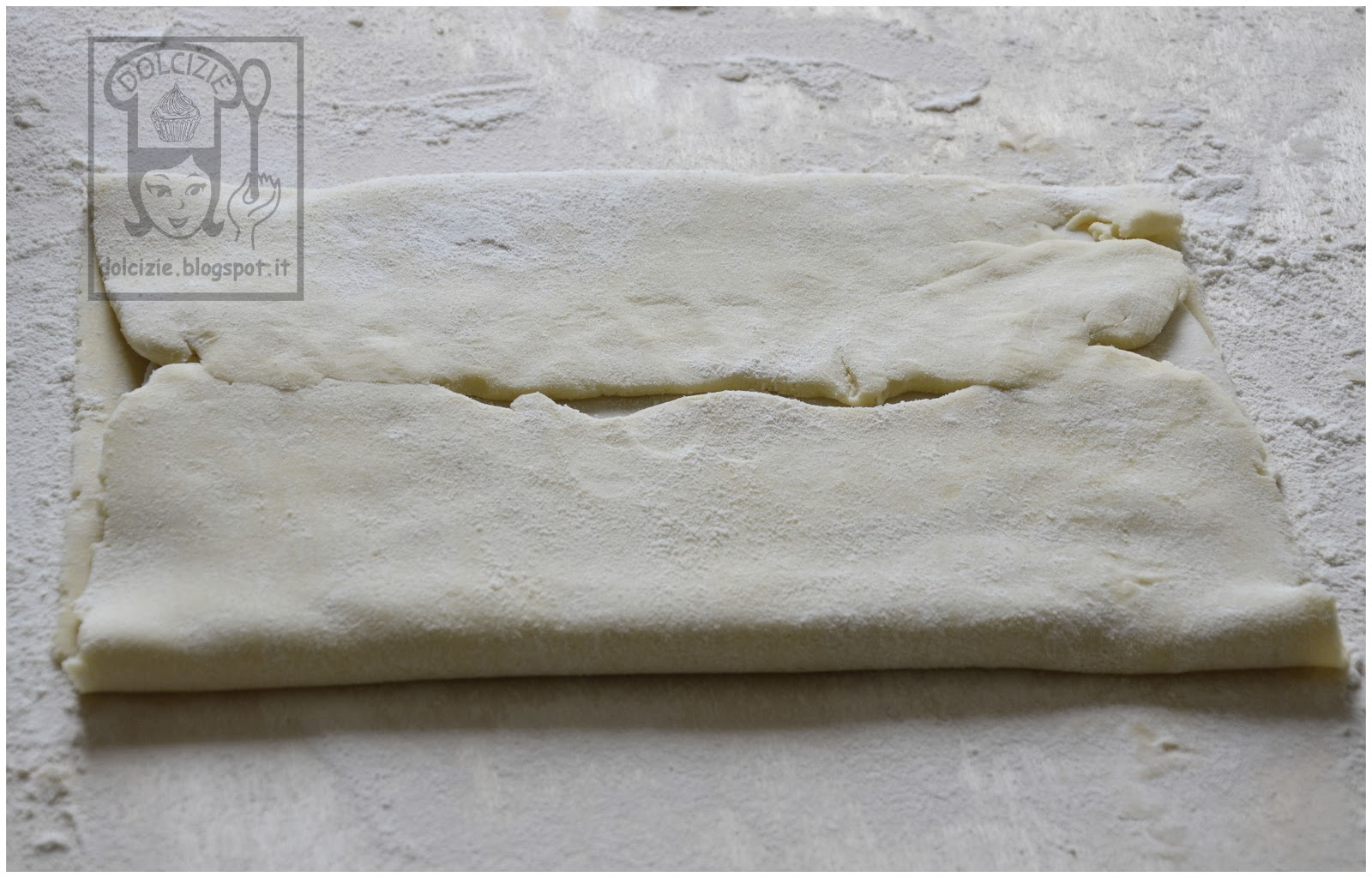 Per fare il giro doppio dovete ripiegare la pasta con un giro semplice (ripiego i due quarti esterni verso il centro e premo con il mattarello leggermente in punto di incontro centrale) quindi sovrapponete le due metà della pasta.