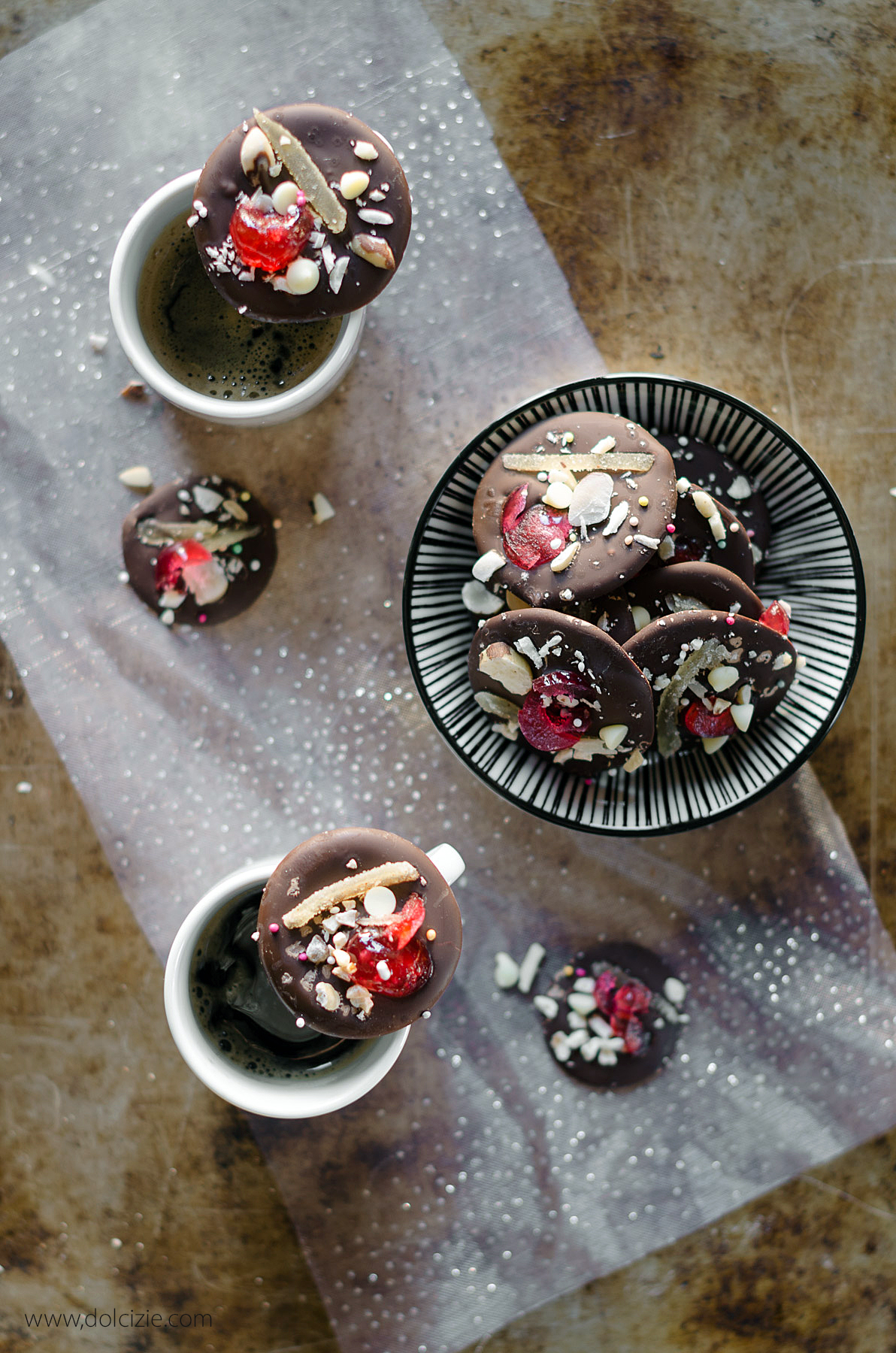 2 – Disponete su ciascun mendiant un pezzettino di ciò che avete preparato e vi piace. Io amo l’abbinamento con lo zenzero.