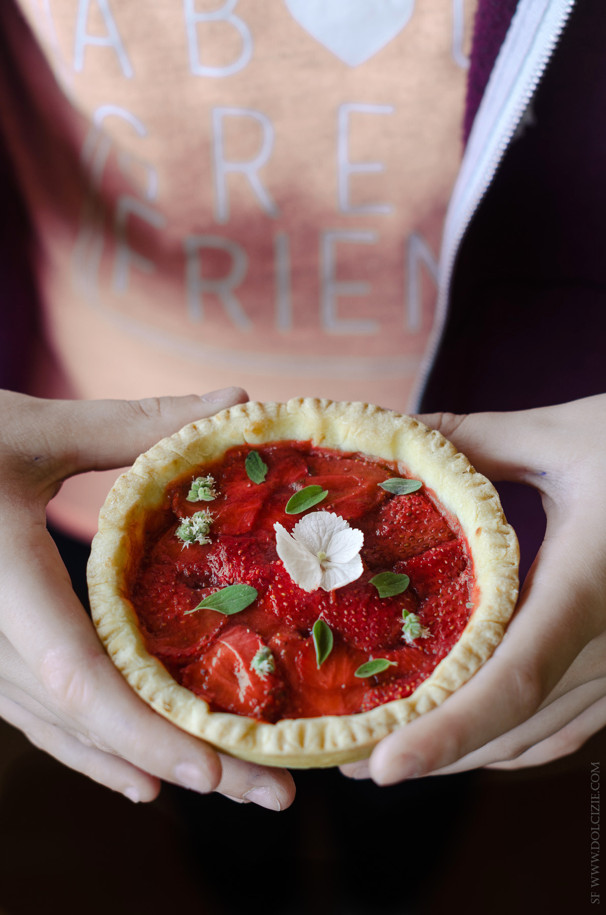 In una casseruolina unite le fragole tagliate e lo sciroppo d’acero e portate a leggera ebollizione, mescolando continuamente. Non appena le fragole inizieranno a rilasciare acqua, aggiungete lo zucchero un cucchiaio alla volta, finché lo sciroppo non si addensa. A seconda di quanto sono mature le fragole potrebbe non servirvi tutto lo zucchero. Una volta che lo sciroppo si sarà addensato, frullate il tutto con l’aiuto di un minipimer. Versate lo sciroppo sulla tart finché non avrà coperto uniformemente tutte le fragole. Fate raffreddare, quindi decorate con altro timo.
