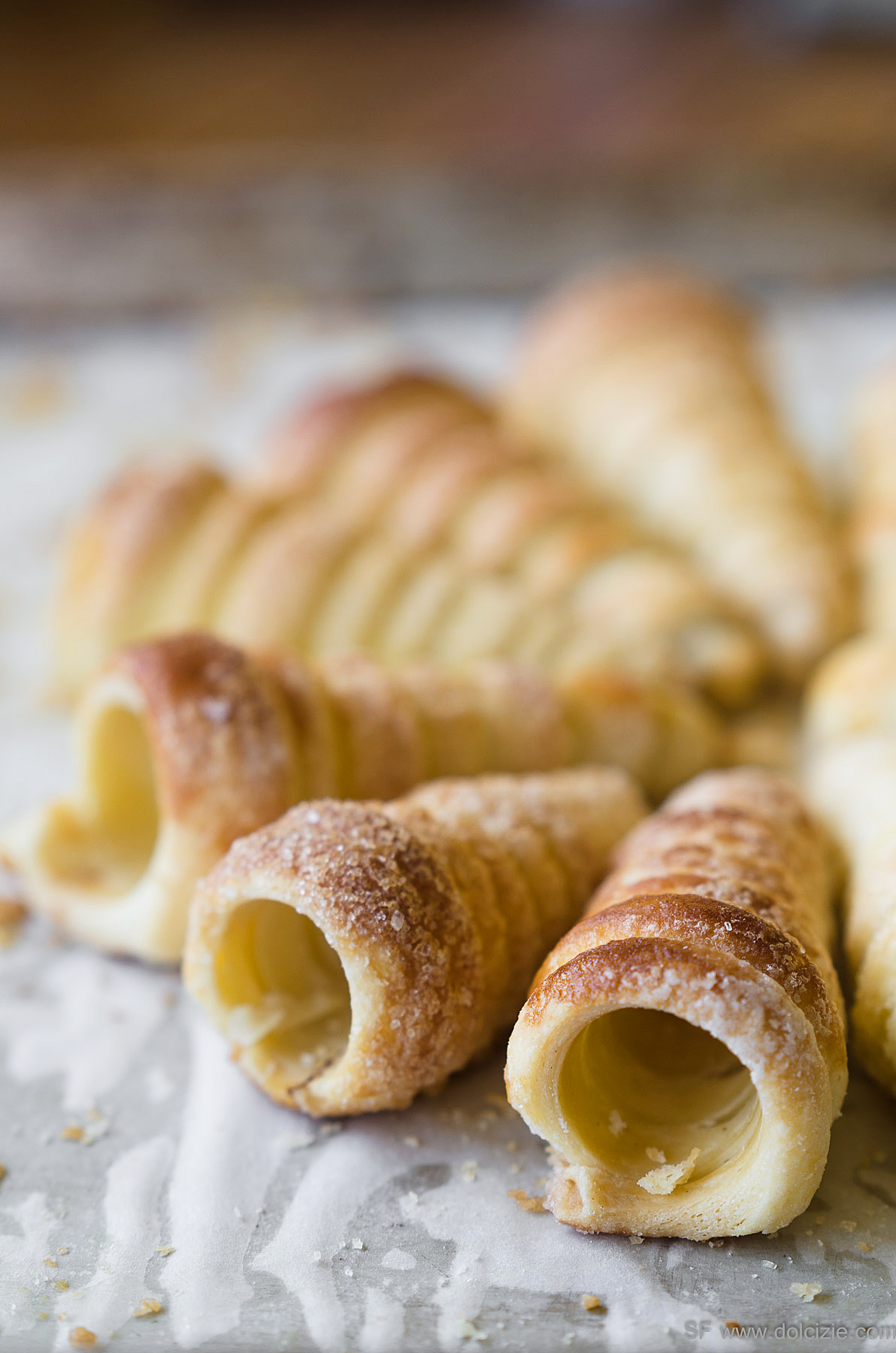 Stendete l’impasto fino a ottenere uno spessore di 5mm. Tagliate delle stricioline e spennellatele con un uovo leggermente sbattuto. Avvolgetele sui vostri stampini quindi spennellatele nuovamente.